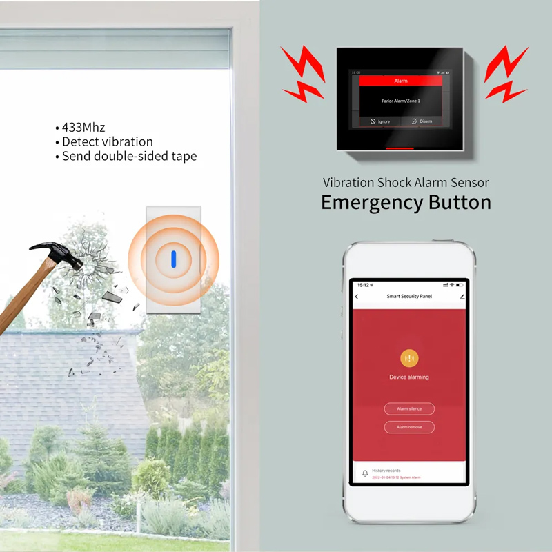 Ο ασύρματος ανιχνευτής θραύσης κρυστάλλων τοποθετείται εύκολα σε γυάλινες πόρτες και τζάμια. Ανιχνεύει τους κραδασμούς σε περίπτωση θραύσης της γυάλινης πόρτας/τζαμιού και στέλνει ειδοποίηση στο κεντρικό σύστημα συναγερμού. Επιπλέον, ενσωματώνει κρυφό κουμπί πανικού για περιπτώσεις έκτακτης ανάγκης.