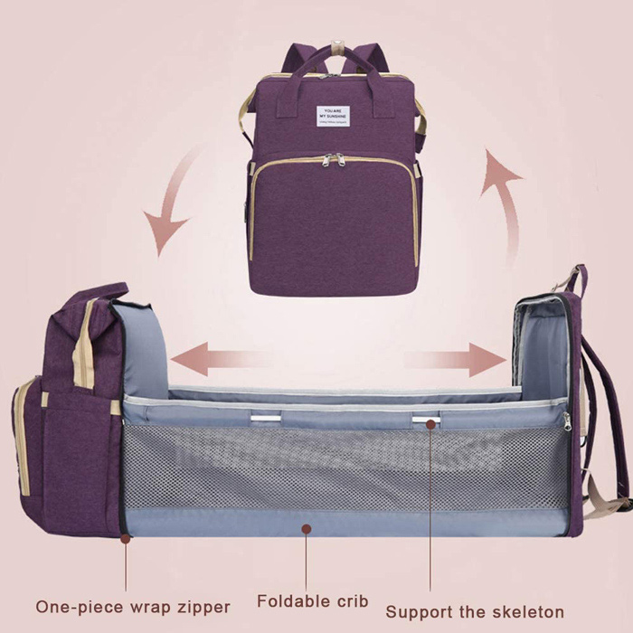 Τσάντα πλάτης που μετατρέπεται σε παιδικό κρεβατάκι. Είναι κατασκευασμένη από υψηλής ποιότητας υλικά και αδιάβροχη. Διαθέτει πολλαπλούς χώρους αποθήκευσης μέσα στους οποίους μπορούν να αποθηκευθούν ρούχα, πάνες, πετσέτες, μπιμπερό με γάλα κ.α. Επιπλέον ο εργονομικός σχεδιασμός καθιστά την τσάντα εύκολη και άνετη στην μεταφορά της.