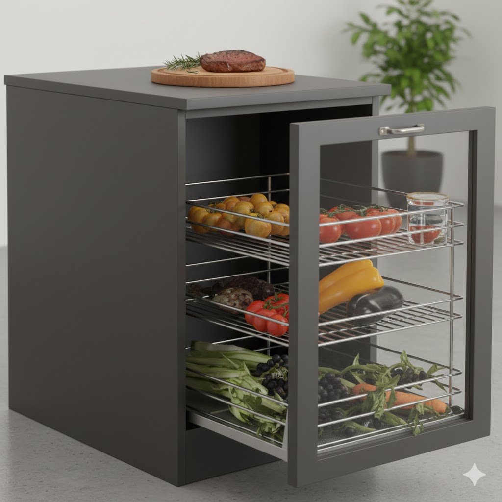 • Τρία Επίπεδα Αποθήκευσης: Μεγάλη χωρητικότητα για λαχανικά, φρούτα ή είδη καθαρισμού.