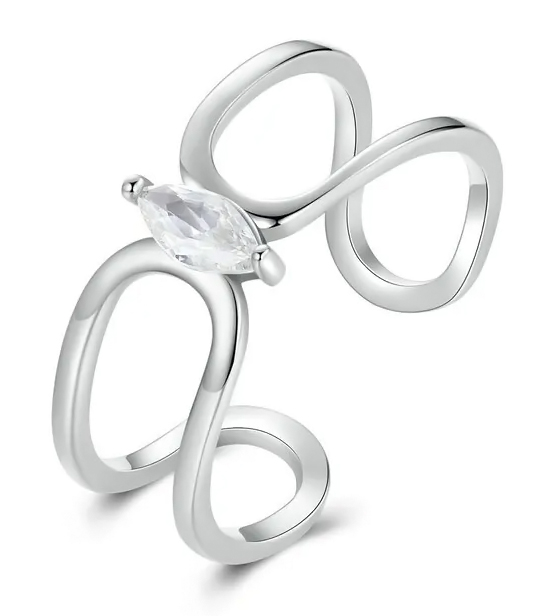 Εντυπωσιακό δαχτυλίδι σε σχήμα πεταλούδας, διακοσμημένο με αστραφτερή κυβική ζιρκόνια, λευκού χρώματος, η οποία αντανακλά μοναδικά το φως και προσφέρει λάμψη στο κόσμημα.