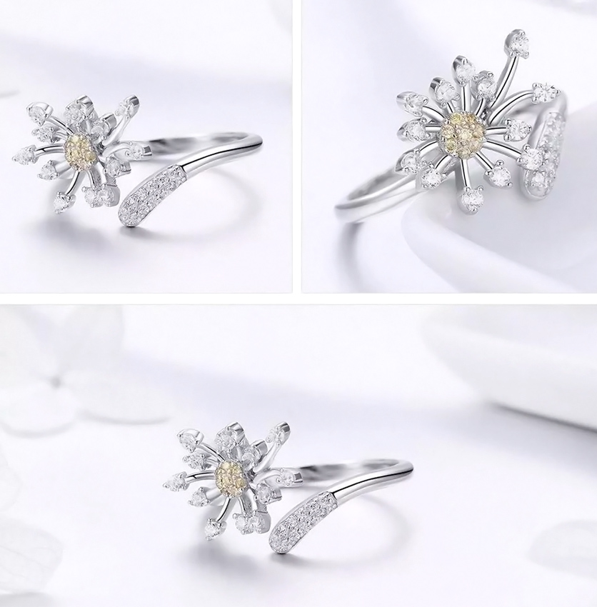Εντυπωσιακό δαχτυλίδι, σε σχήμα dandelion, διακοσμημένο με αστραφτερή κυβική ζιρκόνια, λευκού χρώματος και χρυσού χρώματος, η οποία αντανακλά μοναδικά το φως και προσφέρει λάμψη στο κόσμημα.