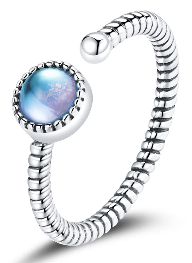 Εντυπωσιακό δαχτυλίδι, διακοσμημένο με συνθετική φεγγαρόπετρα, η οποία αντανακλά μοναδικά το φως και προσφέρει λάμψη στο κόσμημα.