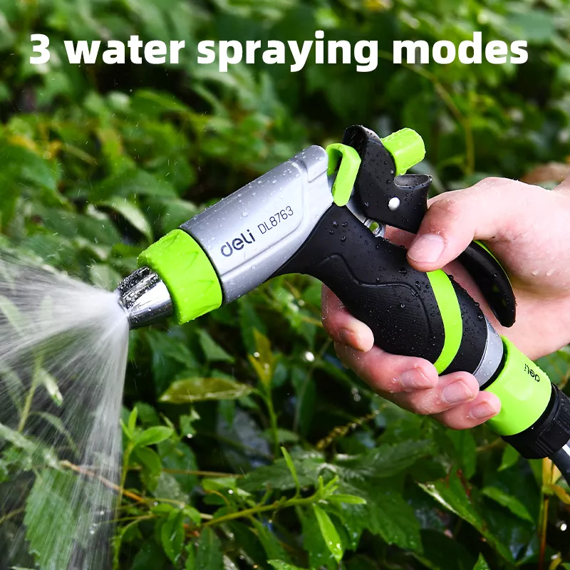 Πιστόλι εκτόξευσης νερού της Deli με 3 λειτουργίες ψεκασμού. Διαθέτει αντιολισθητική λαβή που εφαρμόζει καλά στο χέρι για πιο ξεκούραστο πότισμα.