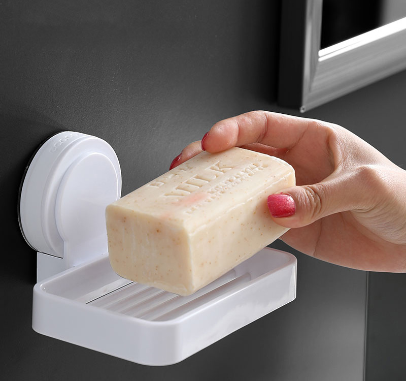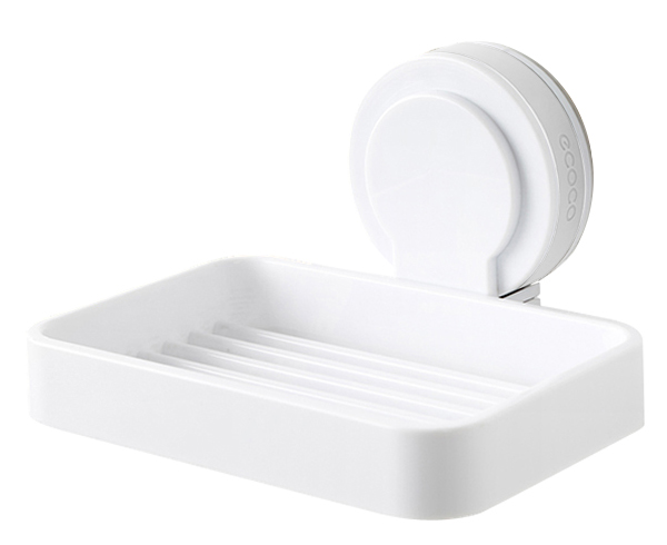 Βάση μπάνιου της Ecoco για σαπούνι, σε λευκό χρώμα. Τοποθετείται εύκολα στον τοίχο με αυτοκόλλητο το οποίο αποσπάται από την βάση, διευκολύνοντας τον καθαρισμό της.
