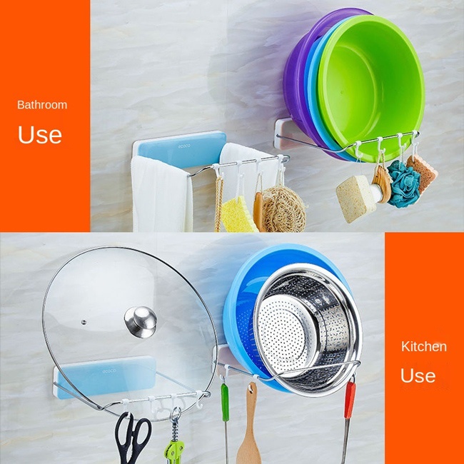 Βάση τοίχου της Ecoco, ιδανική για την κουζίνα ή το μπάνιο. Προσφέρει χώρους αποθήκευσης διαφόρων σκευών όπως τηγάνια, καπάκια κατσαρόλας και λεκάνες ενώ εξοπλίζεται με 4 γάντζους για την αποθήκευση περισσότερων σκευών. Τοποθετείται εύκολα σε οποιαδήποτε επίπεδη επιφάνεια με αυτοκόλλητα κλιπ τα οποία αποσπώνται από την βάση, διευκολύνοντας τον καθαρισμό της. Επιπλέον η βάση είναι πτυσσόμενη και μαζεύεται εύκολα για εξοικονόμηση χώρου όταν δεν χρησιμοποιείται.