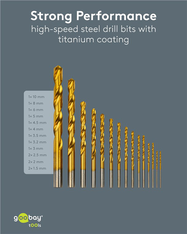 Σετ τρυπάνια της Goobay που αποτελείται από 15 τρυπάνια σε διαφορετικά μεγέθη, κατάλληλα για χρήση σε μεταλλικές επιφάνειες.