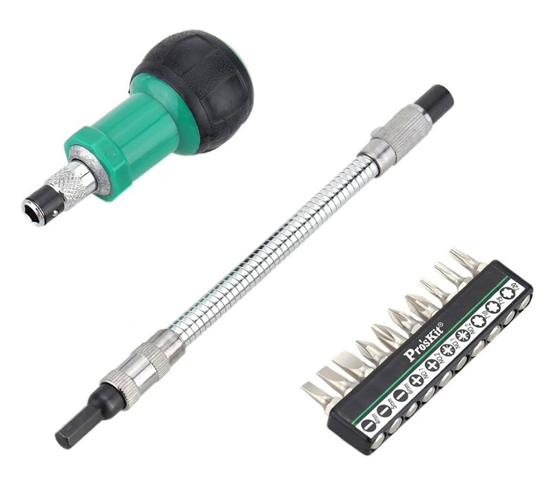 Σετ της PROSKIT το οποίο αποτελείται από 1 κατσαβίδι καστάνιας, 1 εύκαμπτο αντάπτορα επέκτασης και 10 διαφορετικές μύτες κατσαβιδιού.