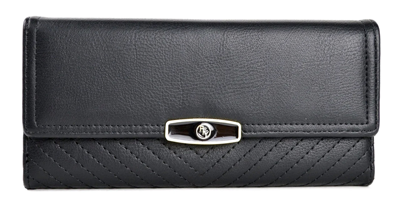 Κομψό, υψηλής ποιότητας γυναικείο πορτοφόλι σε μαύρο χρώμα με χρυσές λεπτομέρειες. Διαθέτει πολλαπλές θέσεις στο εσωτερικό του για χαρτονομίσματα, θέση με φερμουάρ για ψιλά και 10 θέσεις για κάρτες.