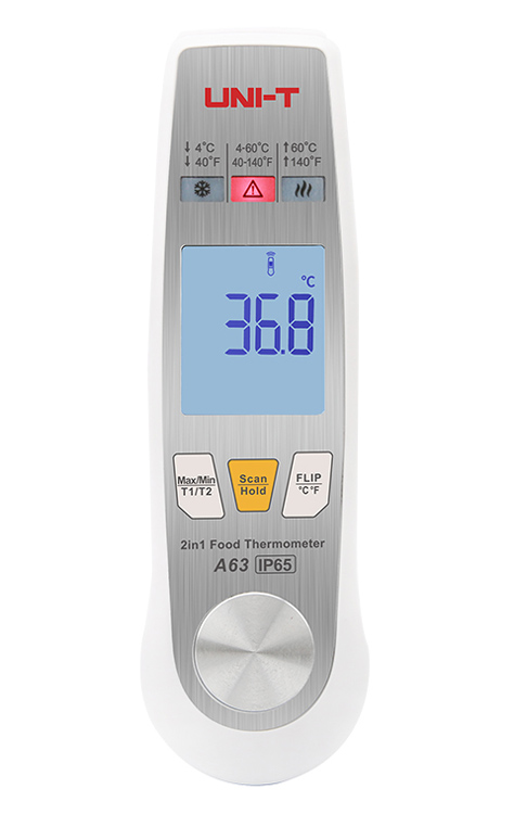 Το A63 είναι ένα θερμόμετρο τροφίμων με αισθητήρα υπερύθρων και πτυσσόμενο αισθητήρα. Παρέχει μια ιδανική λύση μέτρησης και παρακολούθησης της θερμοκρασίας για επαγγελματίες στη βιομηχανία τροφίμων. Ο αισθητήρας υπερύθρων μπορεί να σαρώσει γρήγορα τη θερμοκρασία επιφάνειας των τροφίμων ενώ ο πτυσσόμενο αισθητήρας μπορεί να χρησιμοποιηθεί για την μέτρηση της θερμοκρασίας στο εσωτερικό του τροφίμου. Διαθέτει δείκτη φωτός για το εύρος θερμοκρασίας, λειτουργία που το καθιστά ιδανικό HACCP (Hazard Analysis and Critical Control Point) επιθεώρηση, για τη διασφάλιση της ασφάλειας των τροφίμων. Είναι κατάλληλο για βιομηχανίες επεξεργασία, μεταφοράς και αποθήκευσης τροφίμων, για καταστήματα εστίασης κ.α.